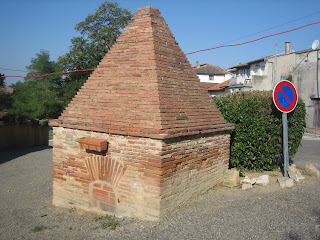 In the hilltop bastide of Monferran-Savès I emptied my rucksack of all unnecessary stuff and sent it back home via the very helpful post office. The fashionably dressed village postmistress (she was très à la mode - this is France, remember!) seemed to have all the time in the world to help me - nothing was too much trouble - and she directed me to an equally helpful grocery store, where they gave me a cardboard box in which to pack my things. It was a relief to carry a little less weight. On leaving the village I passed this old, brick-built bread oven: