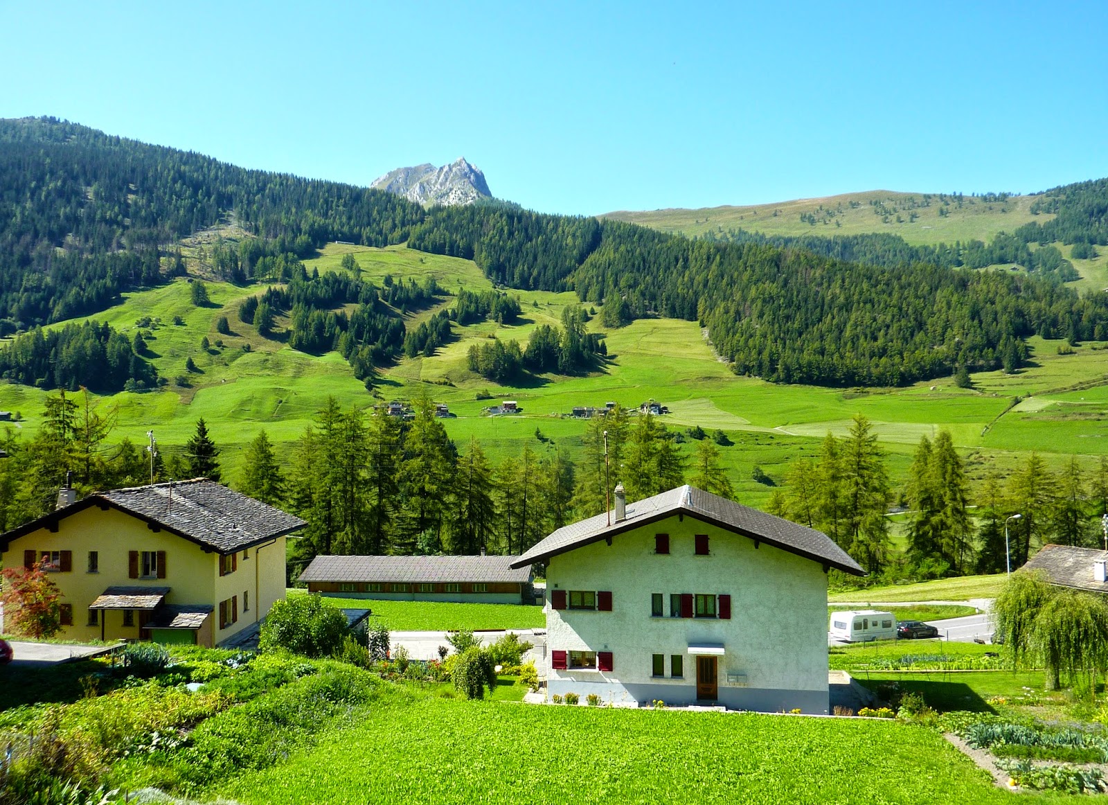 A last look back at Orsières. The early morning sun is just starting to brighten the slopes, but most of the village still remains in shadow. |